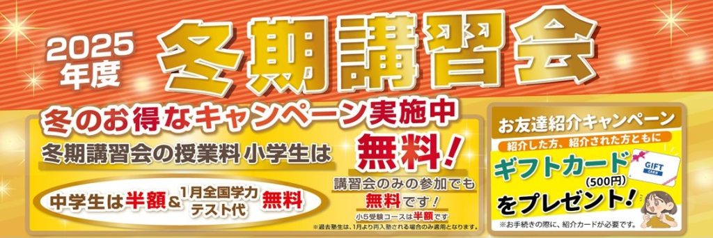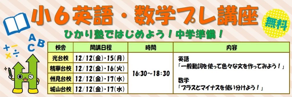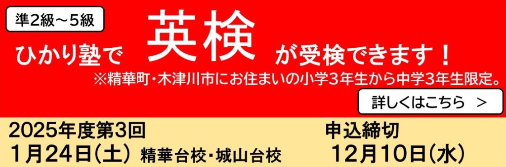 News 2025年11月17日お知らせ冬期講習会申込受付開始しました!New!!2025年11月17日イベント【申込受付中】小6英語・数学プレ講座New!!2025年11月17日お知らせ【申込受付中】2025年度第3回英語検定New!!2025年9月1日お知らせ後期生を募集しています!!2025年9月1日イベント【終了】公立高校進学説明会を開催します! お知らせ一覧へ≫ ひかり塾の強み 1 定期テストで450点が取れる塾!内申とるならひかり塾! 2 実力がつく!抜群の高校入試実績! 3 熱心な講師陣が魅力です! 指導方針 > 7つの特色 > コース紹介 校舎案内 光台本校 (0774)98-0959 精華台校 (0774)98-3959 州見台校 (0774)71-9345 城山台校 (0774)29-2378 合格実績 過去の合格実績はこちらから