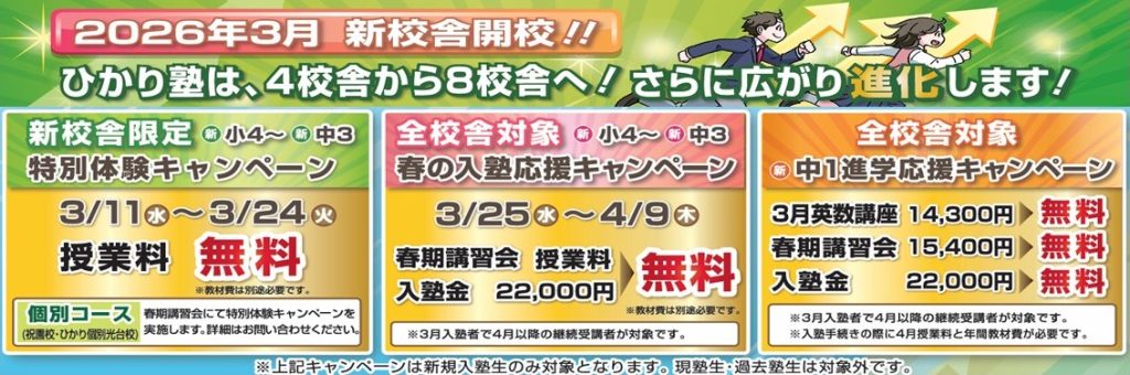 News 2026年1月9日お知らせ2026年3月新校舎を開校します‼New!!2026年1月9日イベント【申込受付中!】2026年度入塾説明会New!!2025年11月17日お知らせ冬期講習会申込受付開始しました!2025年11月17日イベント【イベント終了】小6英語・数学プレ講座2025年11月11日お知らせ【受付終了しました】2025年度第3回英語検定 お知らせ一覧へ≫ ひかり塾の強み 1 定期テストで450点が取れる塾!内申とるならひかり塾! 2 実力がつく!抜群の高校入試実績! 3 熱心な講師陣が魅力です! 指導方針 > 7つの特色 > コース紹介 校舎案内 光台本校 (0774)98-0959 精華台校 (0774)98-3959 州見台校 (0774)71-9345 城山台校 (0774)29-2378 合格実績 過去の合格実績はこちらから 二つ星を宣言しました