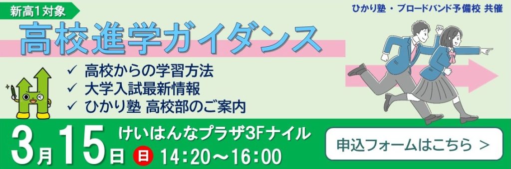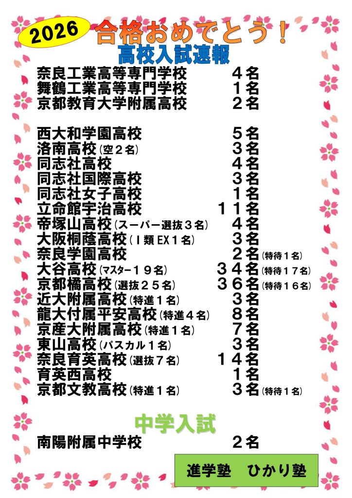 News 2026年2月18日イベント【申込受付中‼】高校進学ガイダンスNew!!2026年2月9日イベント【日程追加】2026年度入塾説明会New!!2026年2月5日イベント【申込受付中!】南陽附属中学入試分析会のお知らせNew!!2026年1月9日お知らせ2026年3月新校舎を開校します‼2025年11月17日お知らせ冬期講習会申込受付開始しました! お知らせ一覧へ≫ ひかり塾の強み 1 定期テストで450点が取れる塾!内申とるならひかり塾! 2 実力がつく!抜群の高校入試実績! 3 熱心な講師陣が魅力です! 指導方針 7つの特色 コース紹介 小学部のご案内 小学部 中学受験 中学部のご案内 高校部のご案内 ひかり個別 南陽 中学・高校 校舎案内 光台本校 グループリンク 精華台校 グループリンク 州見台校 グループリンク 城山台校 グループリンク ひかり個別光台校 グループリンク 祝園校 グループリンク 山田川校 グループリンク 高の原校 グループリンク 合格実績 過去の合格実績はこちらから 二つ星を宣言しました