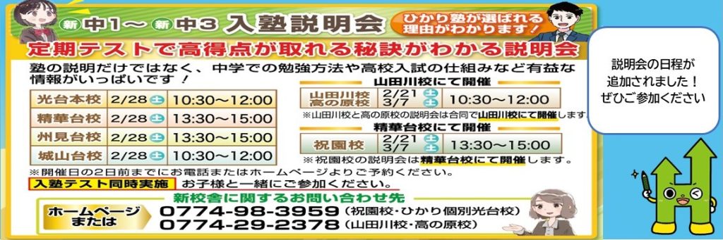 News 2026年2月5日イベント【申込受付中!】南陽附属中学入試分析会のお知らせNew!!2026年1月9日お知らせ2026年3月新校舎を開校します‼2026年1月9日イベント【申込受付中!】2026年度入塾説明会2025年11月17日お知らせ冬期講習会申込受付開始しました!2025年11月17日イベント【イベント終了】小6英語・数学プレ講座 お知らせ一覧へ≫ ひかり塾の強み 1 定期テストで450点が取れる塾!内申とるならひかり塾! 2 実力がつく!抜群の高校入試実績! 3 熱心な講師陣が魅力です! 指導方針 7つの特色 コース紹介 小学部のご案内 小学部 中学受験 中学部のご案内 高校部のご案内 ひかり個別 南陽 中学・高校 校舎案内 光台本校 グループリンク 精華台校 グループリンク 州見台校 グループリンク 城山台校 グループリンク ひかり個別光台校 グループリンク 祝園校 グループリンク 山田川校 グループリンク 高の原校 グループリンク 合格実績 過去の合格実績はこちらから 二つ星を宣言しました