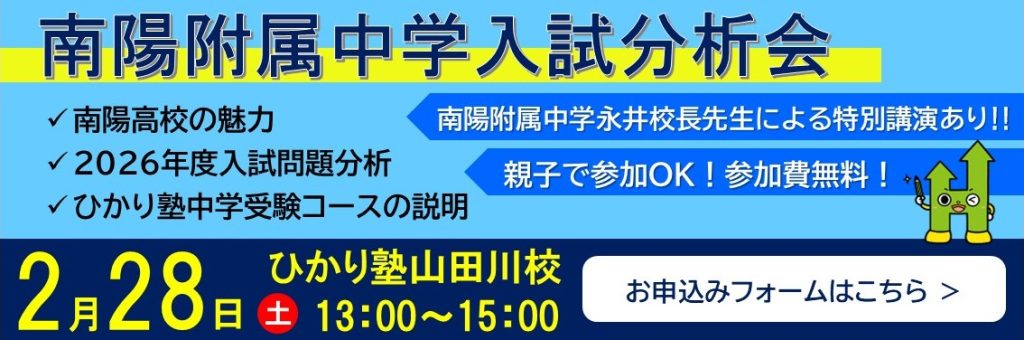 News 2026年2月5日イベント【申込受付中!】南陽中学入試分析会のお知らせNew!!2026年1月9日お知らせ2026年3月新校舎を開校します‼New!!2026年1月9日イベント【申込受付中!】2026年度入塾説明会New!!2025年11月17日お知らせ冬期講習会申込受付開始しました!2025年11月17日イベント【イベント終了】小6英語・数学プレ講座 お知らせ一覧へ≫ ひかり塾の強み 1 定期テストで450点が取れる塾!内申とるならひかり塾! 2 実力がつく!抜群の高校入試実績! 3 熱心な講師陣が魅力です! 指導方針 7つの特色 コース紹介 小学部のご案内 小学部 中学受験 中学部のご案内 高校部のご案内 ひかり個別 南陽 中学・高校 校舎案内 光台本校 グループリンク 精華台校 グループリンク 州見台校 グループリンク 城山台校 グループリンク ひかり個別光台校 グループリンク 祝園校 グループリンク 山田川校 グループリンク 高の原校 グループリンク 合格実績 過去の合格実績はこちらから 二つ星を宣言しました