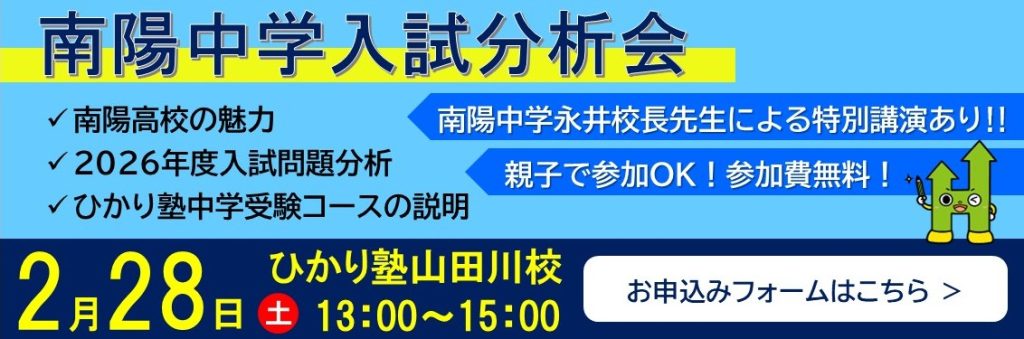 News 2026年1月9日お知らせ2026年3月新校舎を開校します‼New!!2026年1月9日イベント【申込受付中!】2026年度入塾説明会New!!2025年11月17日お知らせ冬期講習会申込受付開始しました!2025年11月17日イベント【イベント終了】小6英語・数学プレ講座2025年11月11日お知らせ【受付終了しました】2025年度第3回英語検定 お知らせ一覧へ≫ ひかり塾の強み 1 定期テストで450点が取れる塾!内申とるならひかり塾! 2 実力がつく!抜群の高校入試実績! 3 熱心な講師陣が魅力です! 指導方針 7つの特色 コース紹介 小学部のご案内 小学部 中学受験 中学部のご案内 高校部のご案内 ひかり個別 南陽 中学・高校 校舎案内 光台本校 グループリンク 精華台校 グループリンク 州見台校 グループリンク 城山台校 グループリンク ひかり個別光台校 グループリンク 祝園校 グループリンク 山田川校 グループリンク 高の原校 グループリンク 合格実績 過去の合格実績はこちらから 二つ星を宣言しました