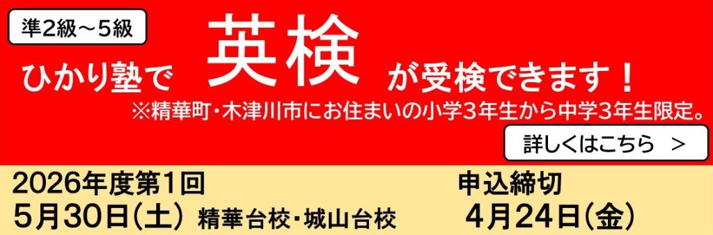 進学塾 ひかり塾 News & Topics 2026年4月6日お知らせ2026年・新年度生を募集していますNew!!2026年4月5日イベント【申込受付中!】2026年度第1回英語検定New!!2026年3月2日お知らせ春期講習会の申込受付開始しました!2026年2月18日イベント【イベント終了】高校進学ガイダンス2026年2月9日イベント【日程追加】2026年度入塾説明会 お知らせ一覧 ひかり塾の強み 定期テストで 450点 が取れる塾!内申とるなら ひかり塾 実力がつく!抜群の 高校入試実績! 熱心な講師陣が魅力です! 指導方針 7つの特色 コース紹介 小学部のご案内 小学部 中学受験 中学部のご案内 高校部のご案内 ひかり個別 南陽 中学・高校 校舎案内 光台本校 グループリンク 精華台校 グループリンク 州見台校 グループリンク 城山台校 グループリンク ひかり個別光台校 グループリンク 祝園校 グループリンク 山田川校 グループリンク 高の原校 グループリンク 合格実績 過去の合格実績はこちら 二つ星を宣言しました